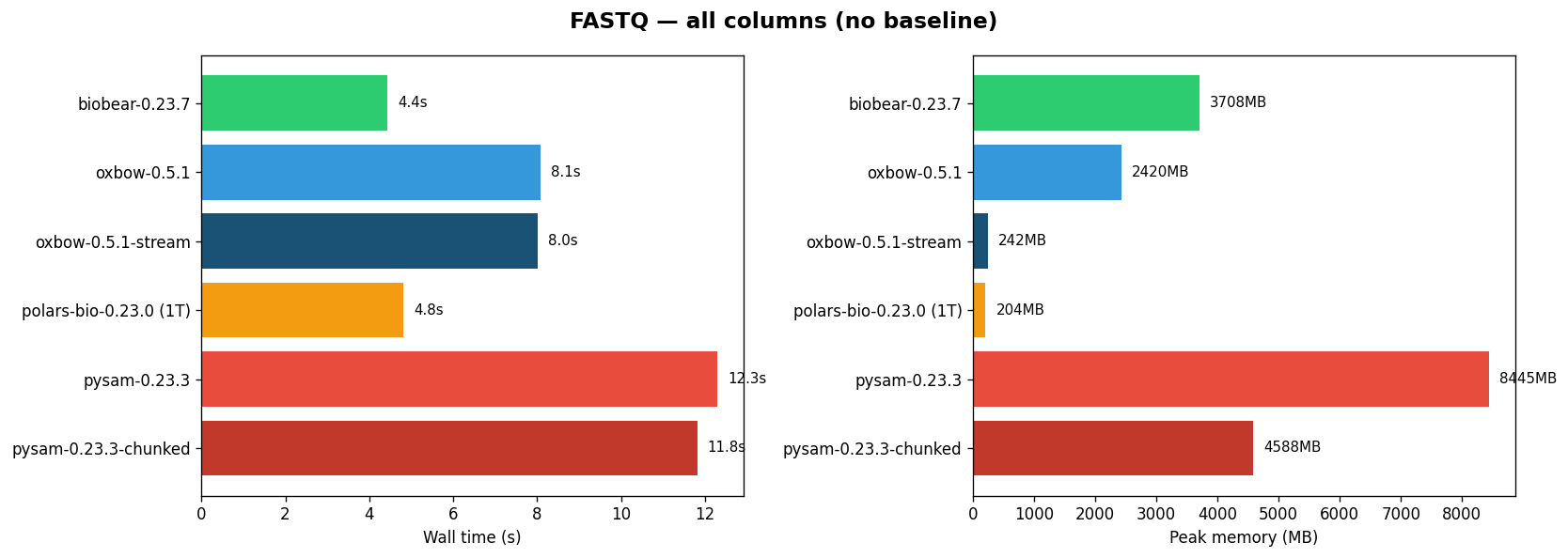 Genomic analyses in Python typically start with reading BAM, VCF, or FASTQ files into memory. The choice of library for this step can have a dramatic impact on both wall-clock time and memory consumption β especially as datasets grow to tens or hundreds of millions of records.