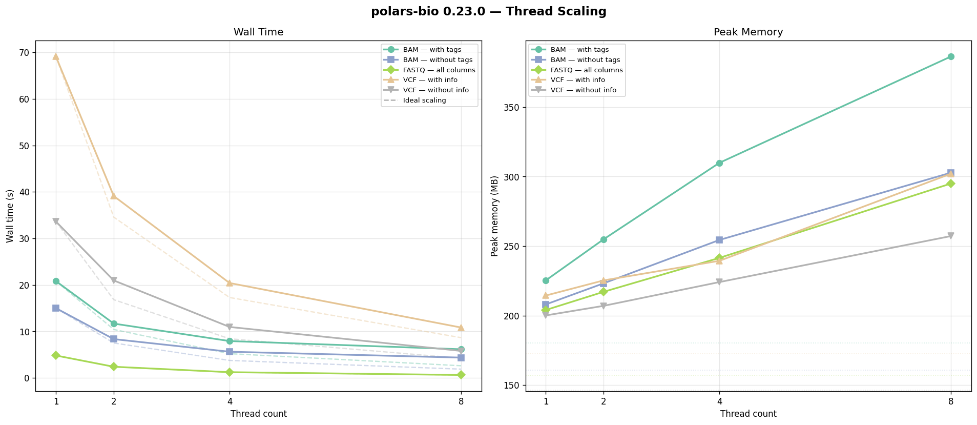 At 8 threads: 6.3 seconds β 52x faster than pysam. Memory remains under 410 MB compared to pysam's 32.9 GB and biobear's 39.9 GB.