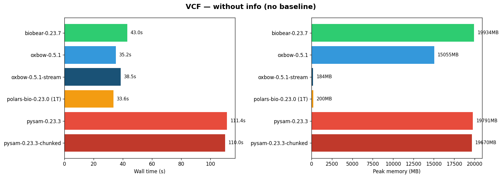 - Handles edge cases where other libraries fail (complex VCF INFO parsing) or time out