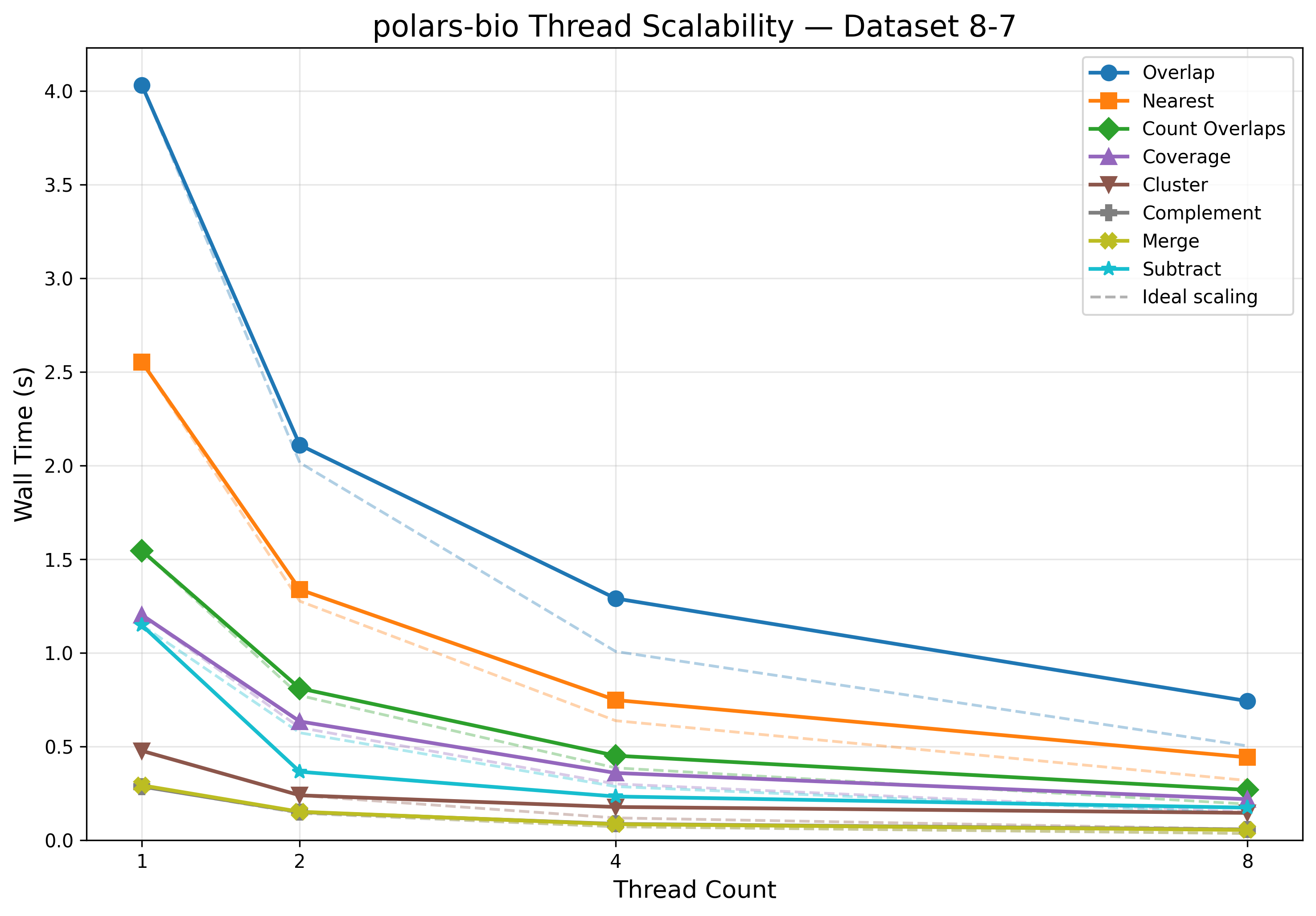 One of polars-bio's key advantages is transparent multithreaded execution. The table below shows wall-clock times for all eight operations on the large dataset (8-7) as thread count increases: